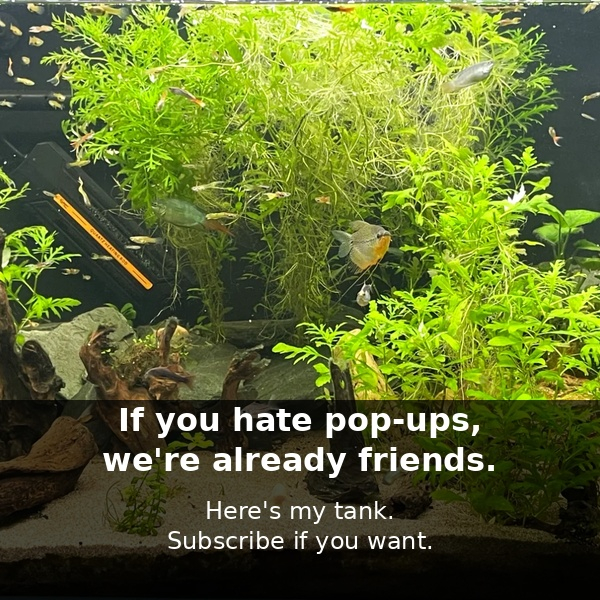 I keep freshwater planted tanks and write about what actually works. No upsells, just what I'm running and why. Learning saltwater next.