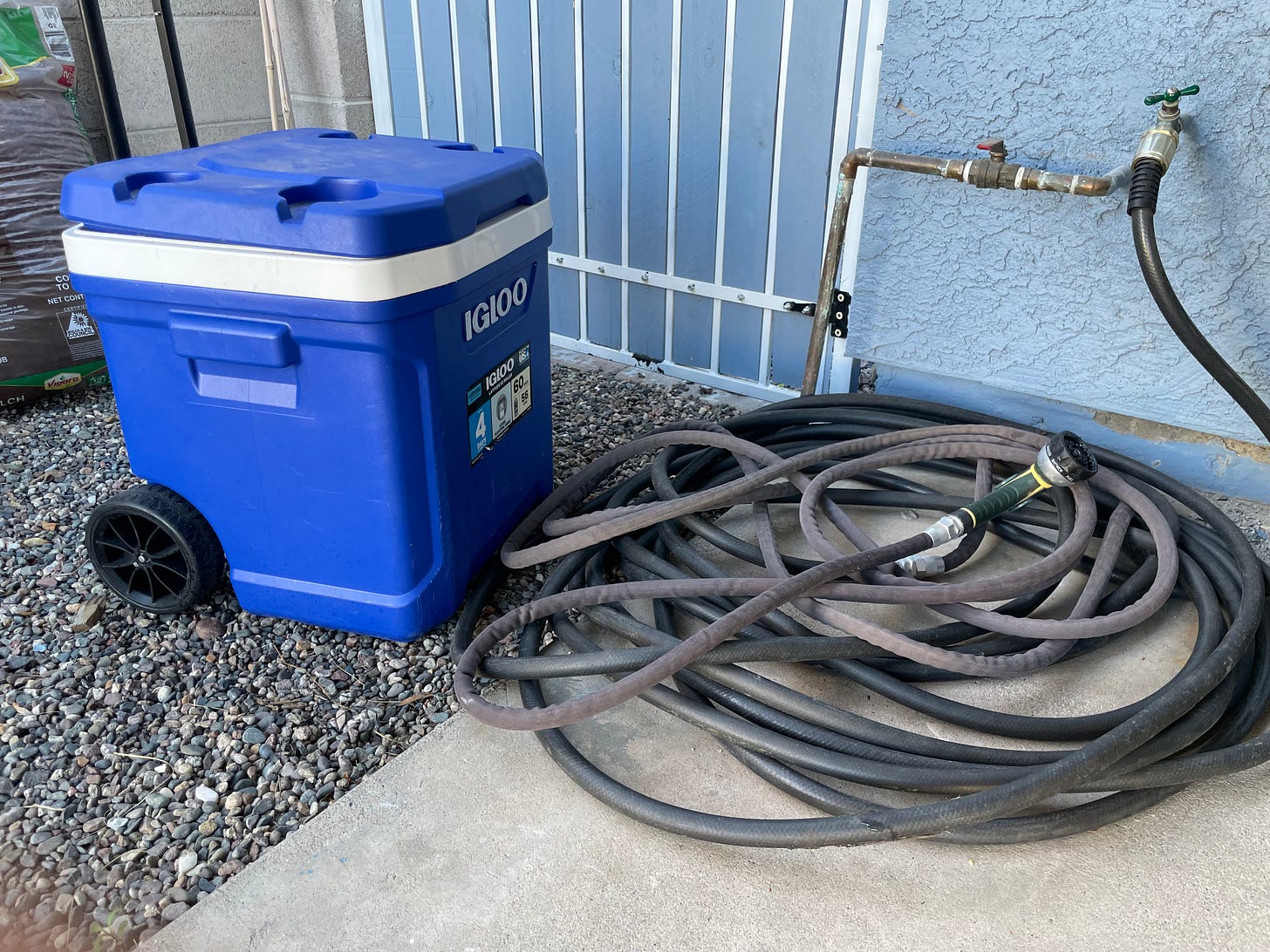 My current method is running a hose from outside through the back door. It’s as janky as it sounds. And I use an old wheeled cooler so I’m not hauling 5-gallon buckets like it’s CrossFit.